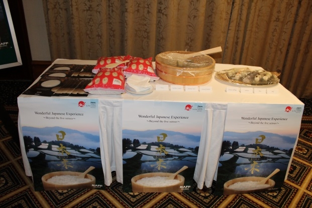 会場では、和食や日本酒も供され、日本米の展示が行われました。